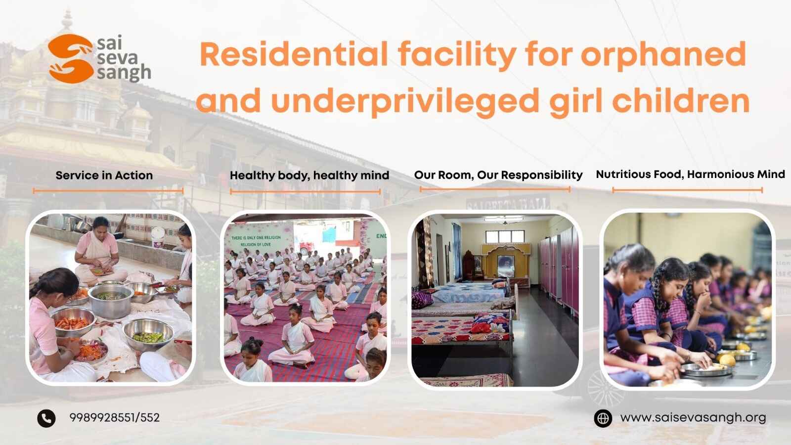 The inspiration came when a young girl studying at Sri Sathya Sai Vidya Mandir, who was a day scholar, lost her parents in a tragic fire accident. Moved by her situation, Sai Seva Sangh decided to extend its care and protection to all such children in need.