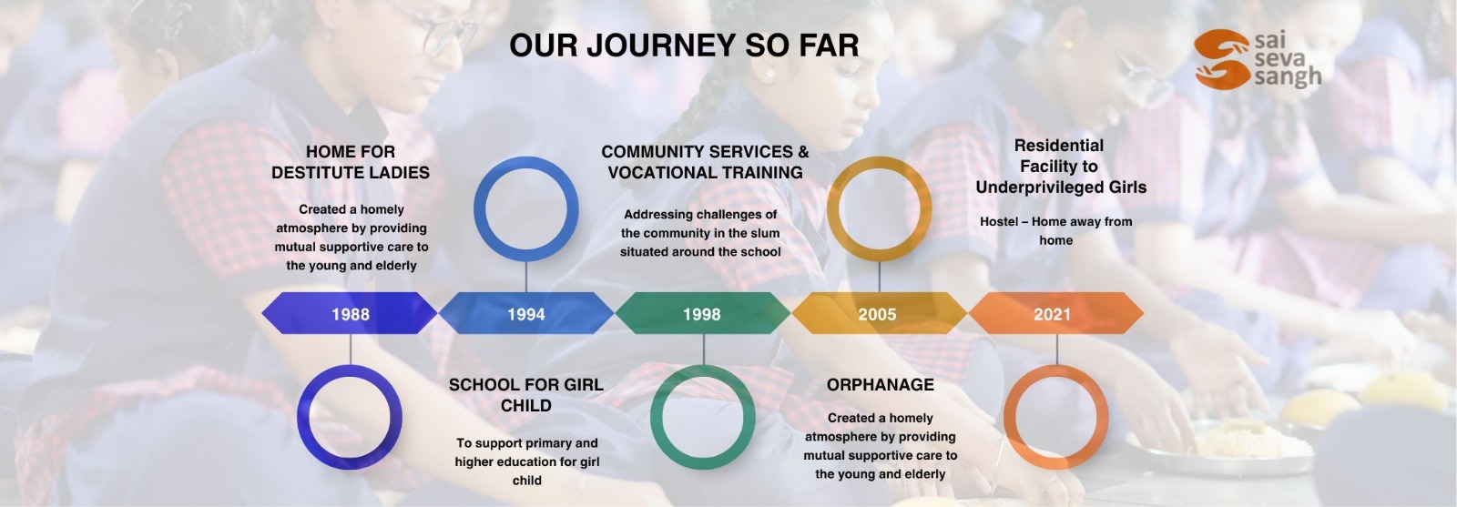 Over the years, Sai Seva Sangh has expanded its reach to address the educational and developmental needs of children and youth from low-income communities. To date, we have positively impacted over 9,000 beneficiaries through our education, welfare, and skill development programmes.